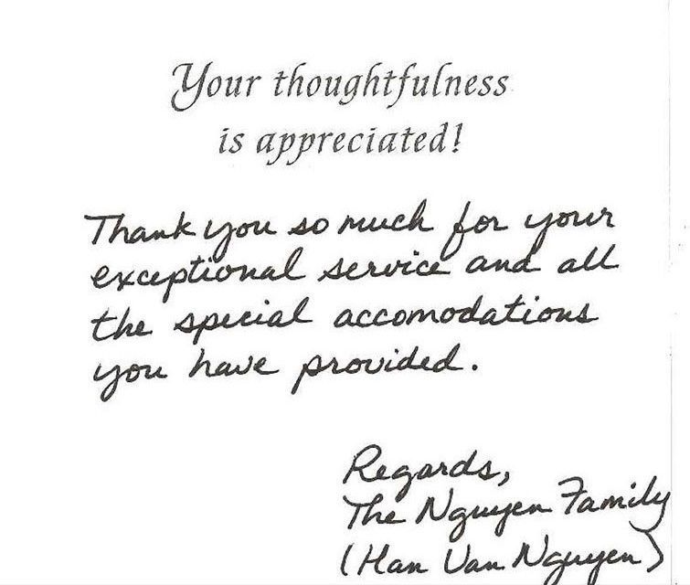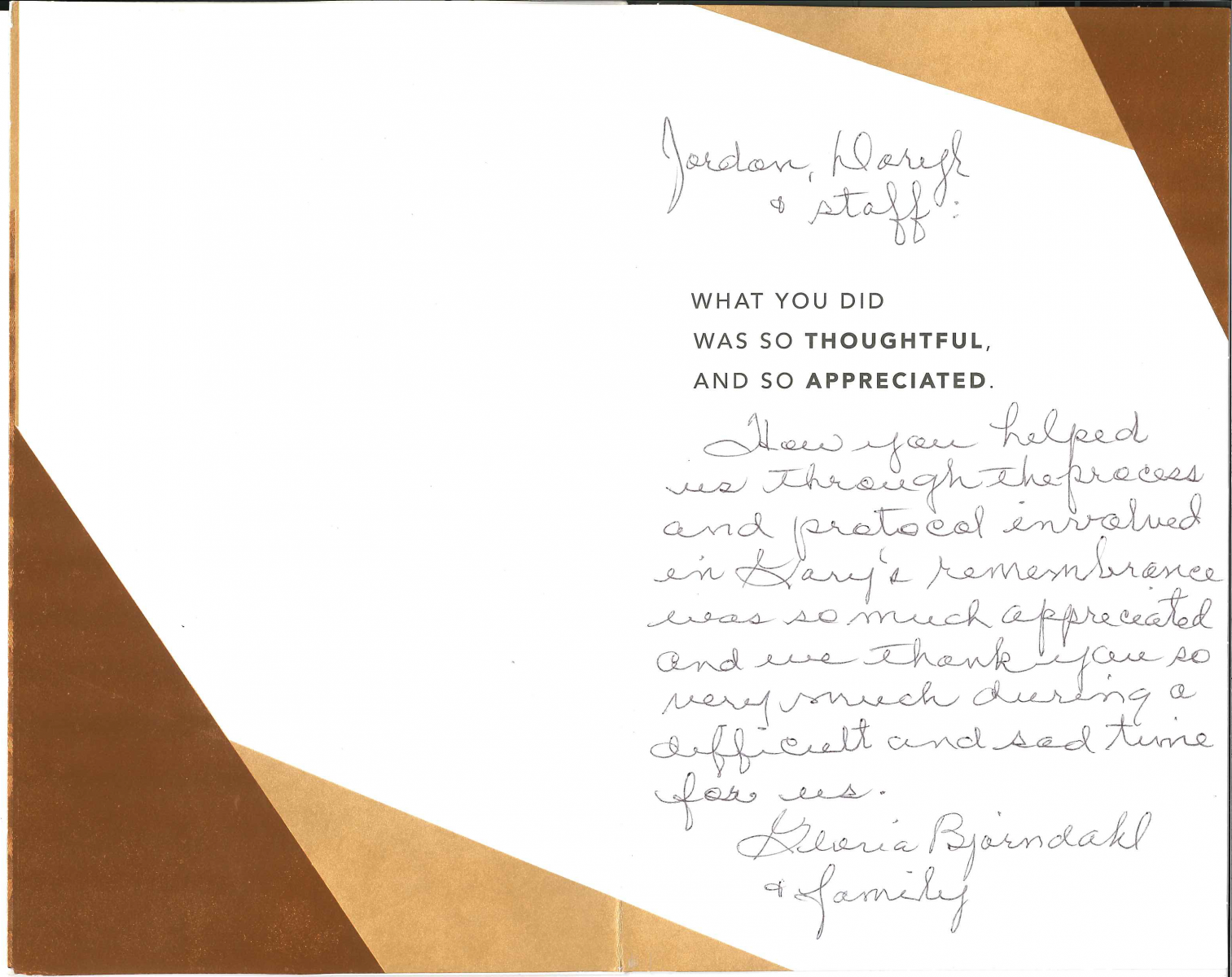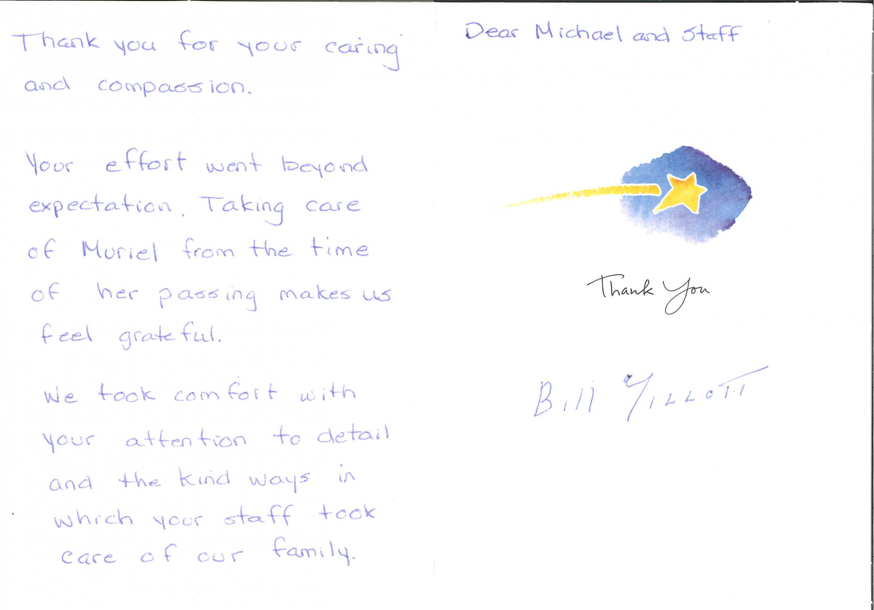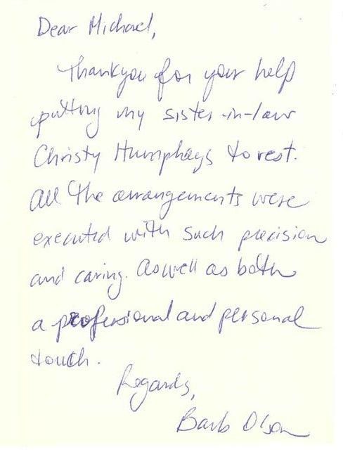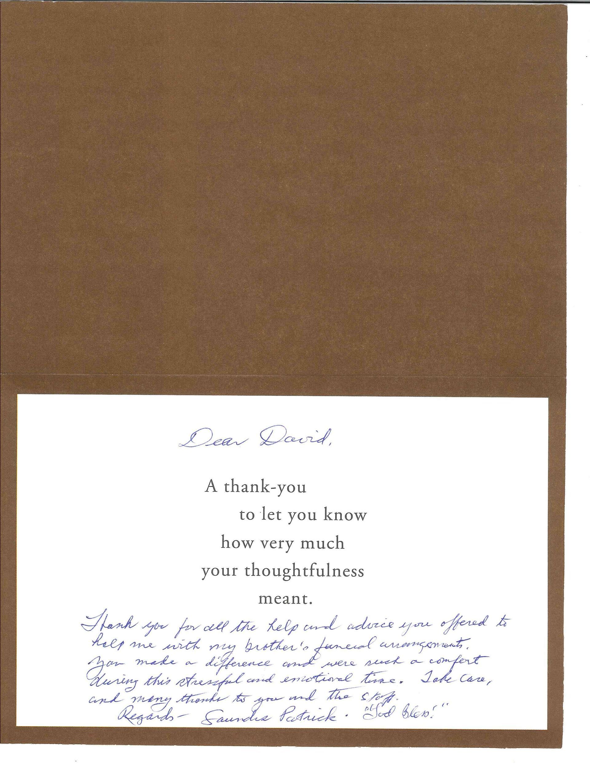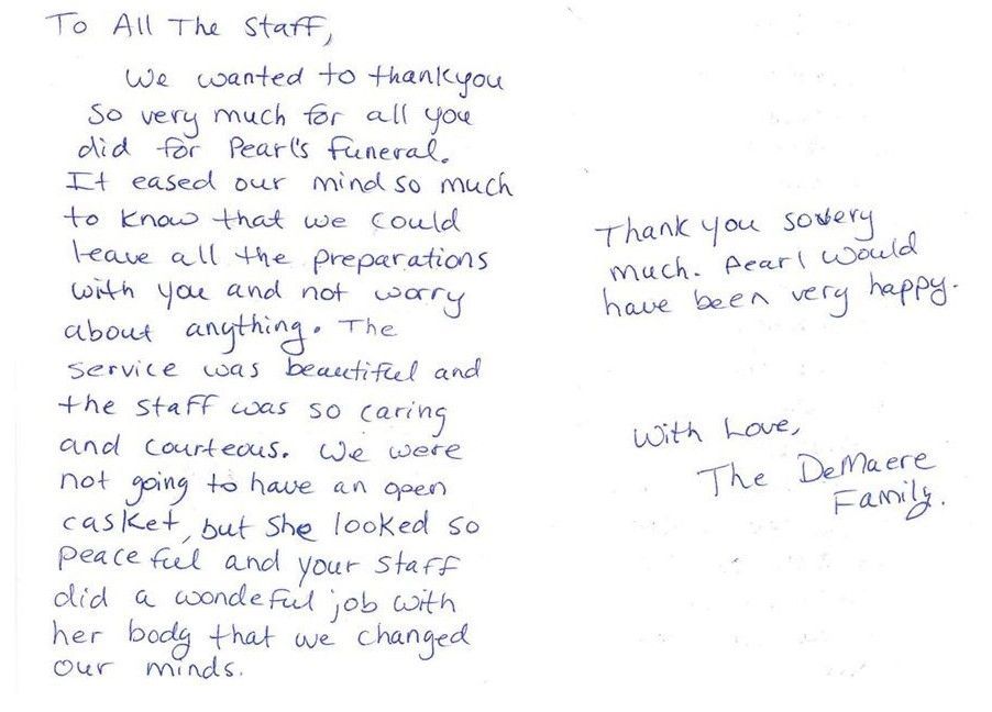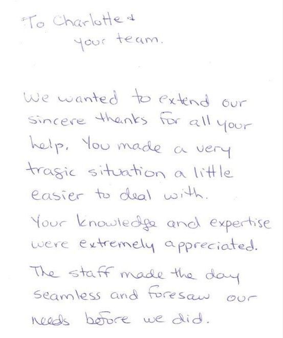 It is our greatest pleasure to hear from families we've served after the service is over. We receive many letters, cards and emails thanking us for our care and attention during their time of need and those words warm our hearts and affirm that we are truly here to serve.