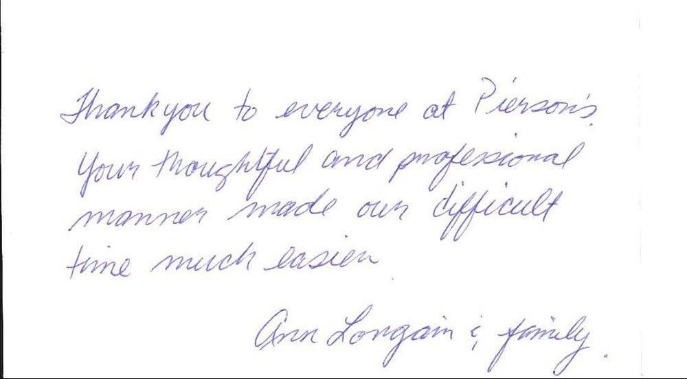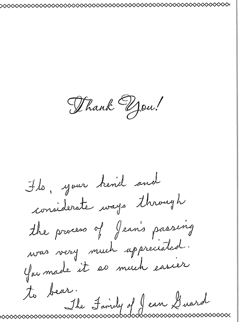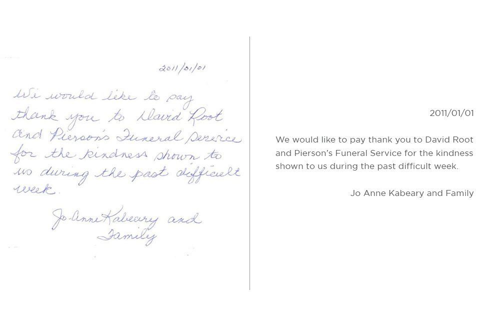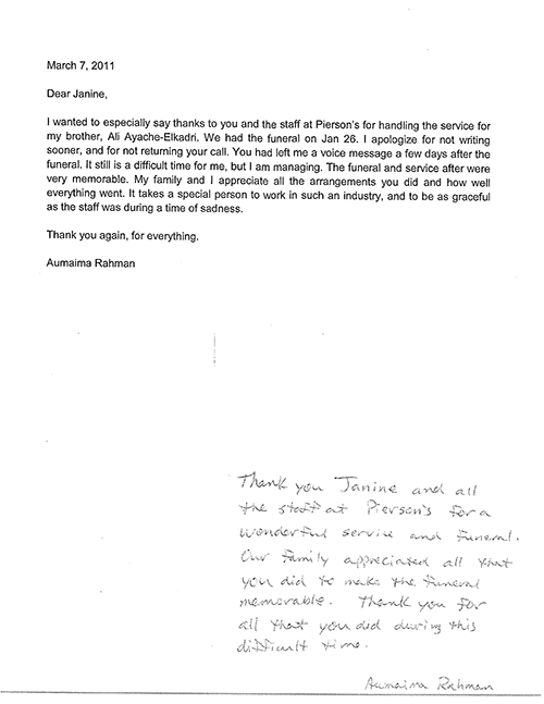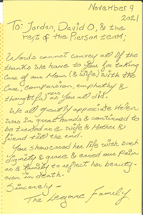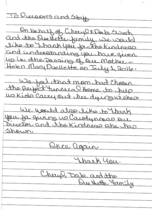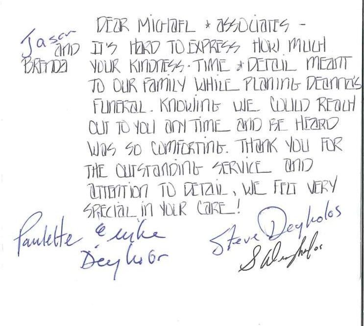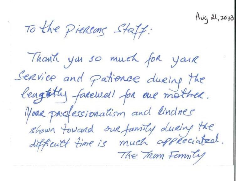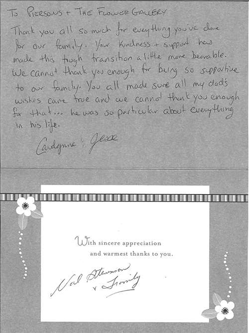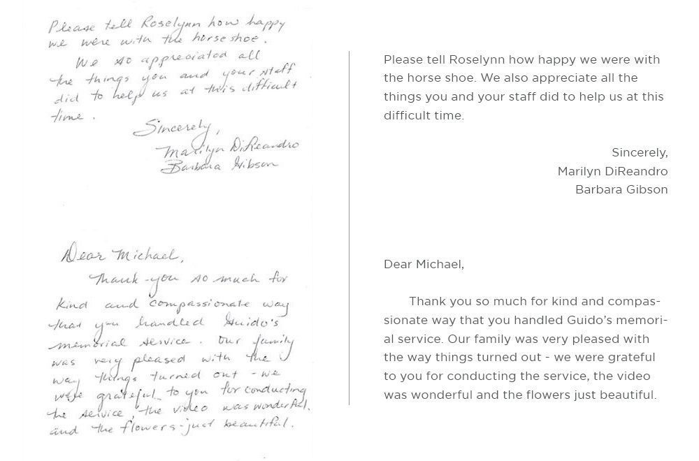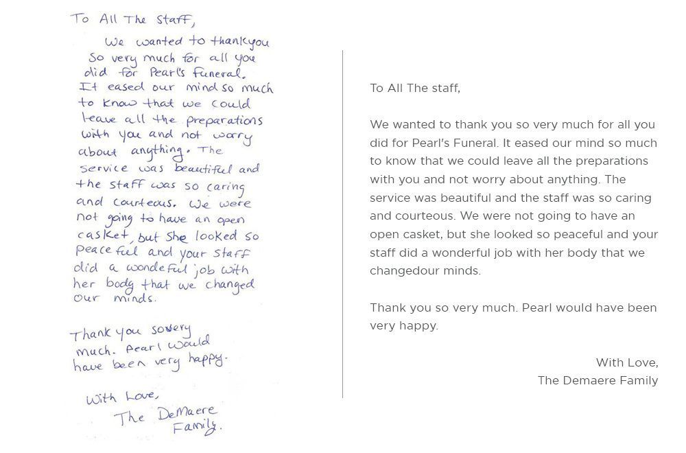 It is our greatest pleasure to hear from families we've served after the service is over. We receive many letters, cards and emails thanking us for our care and attention during their time of need and those words warm our hearts and affirm that we are truly here to serve.